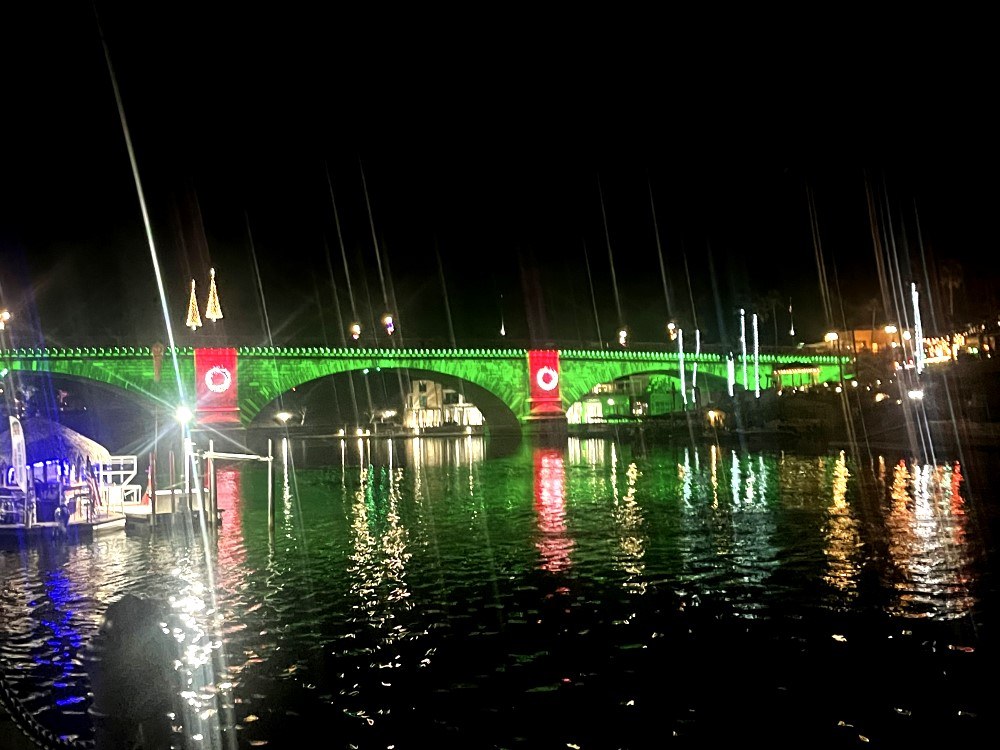 A short walk down the boardwalk and we were in the English Village and enjoyed shopping for souvenirs in the shops. Taking the path back up past our hotel we arrived at the other side of the pool and club of our resort. There they set up Christmas themed drinks, firepits, games for the kids, and even Mrs. Claus and the Grinch were walking around greeting everyone. Take the walkway or take your boat on a night cruise through the Bridgewater Channel as over 500,000 lights set the water aglow.
