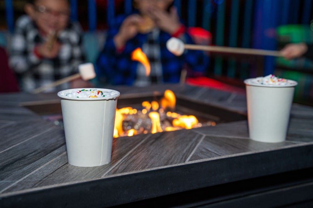 We decided to each try one of their holiday drinks – they had hot coca for the kids and themed adult drinks for the festivities. My wife asked the bartender for a suggestion and was given a hot chocolate with Malibu Rum. I mentioned this because I was jealous! It ended up being the best holiday drink. We sat for a while at one of the firepits, enjoyed our drinks, and took in the fun. Not too far away was the pool club and they were having a bingo night, and it was packed with people laughing and having fun.