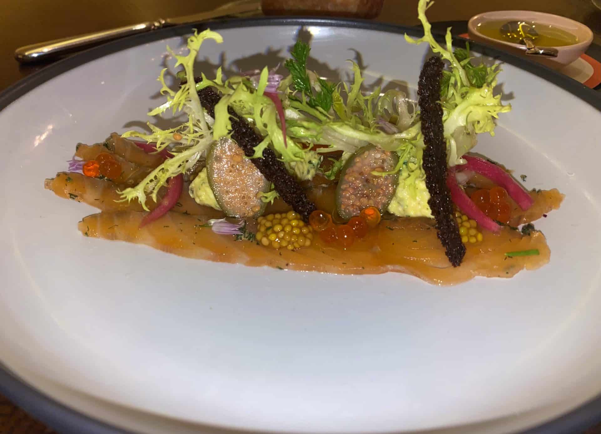 With gribiche, salmon roe, pumpernickel, and caper berries. This dish is artwork. Stunning presentation and a delicious start to the night.