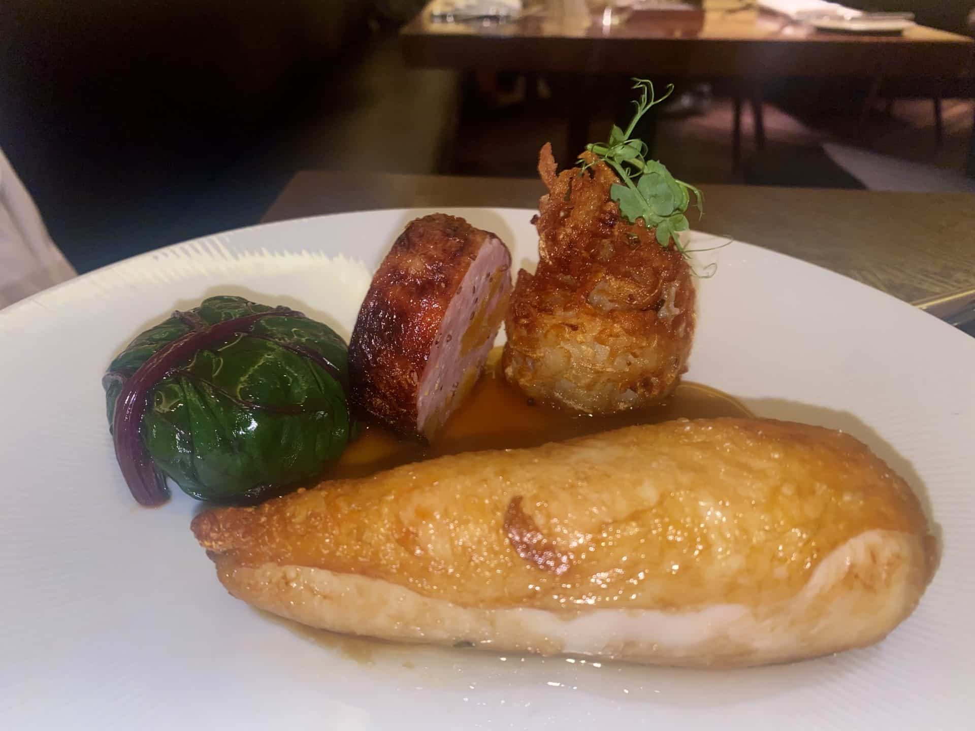 With roulade, potato rosti, swiss chard farci, and natural chicken jus. Simple and satisfying. The chicken is moist and flavorful and the three “sides” complemented it beautifully.