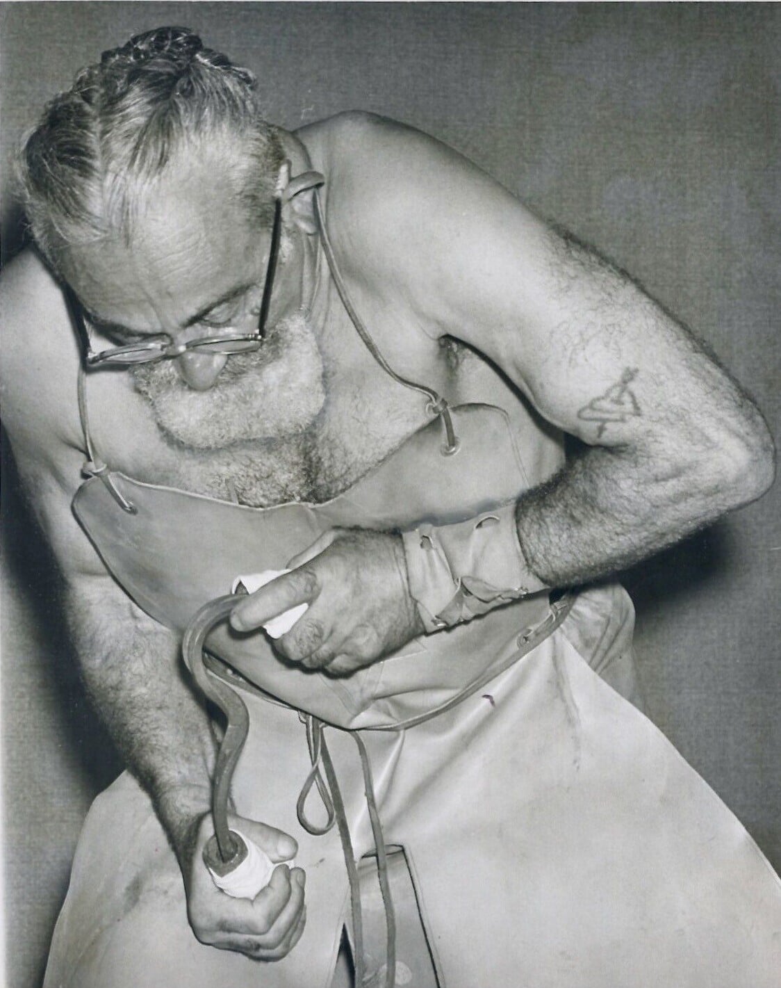 After addressing the crowd, The Mighty Atom picked up a horseshoe and twisted it as easily as a pretzel. My grandfather scoffed. The performer then picked up another horseshoe and handed it to a man standing next to me, who inspected it and attempted to gauge its strength by trying to twist it. However, he merely smiled and handed it back. The Mighty Atom took back the horseshoe and again manipulated it as if it were putty, without any apparent resistance or effort.