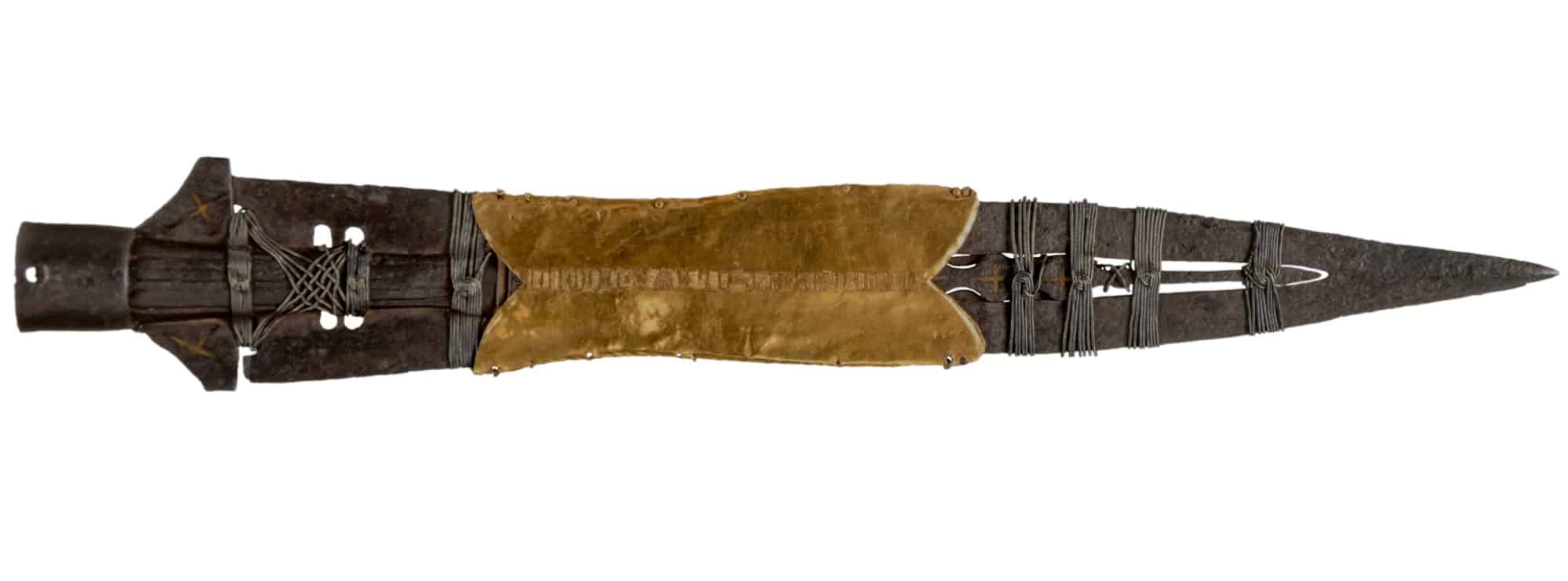 Also know as The Sacred Lance crafted in the Carolingian style which features a distinctive winged design. The lance’s central spine was modified into an elongated oval by removing a section of the blade, creating space for an intricately wrought iron pin or thorn. Additionally, a pair of knife blades symmetrically placed above the lance’s wings are secured with leather straps. It’s believed that the silver wire used in the bindings was added during a later repair, following a break in the lance blade. Over time, devout imagination transformed the central pin into one of the nails believed to have been used in the Crucifixion of Christ.