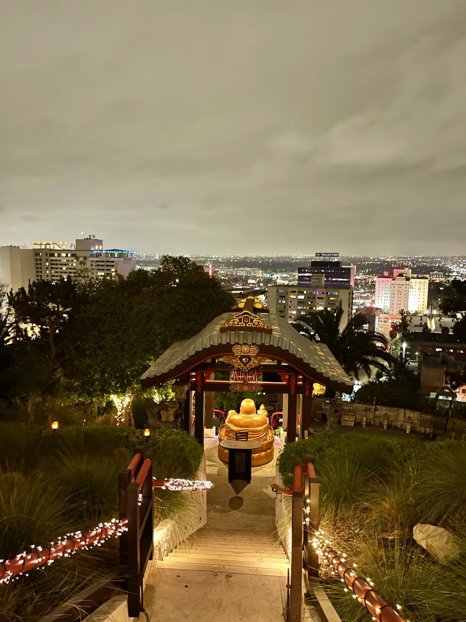 Outside they have a staircase facing the grand views that lead you to a big golden Buddha. It’s said that a happy Buddha placed in a public setting is meant to bring good fortune to all in his presence and spiritual inspiration. It’s a great place to walk to after dinner to reflect and breathe and take in the city.